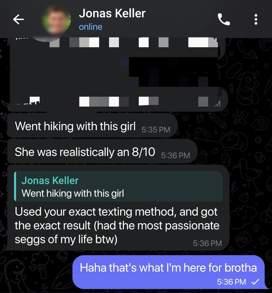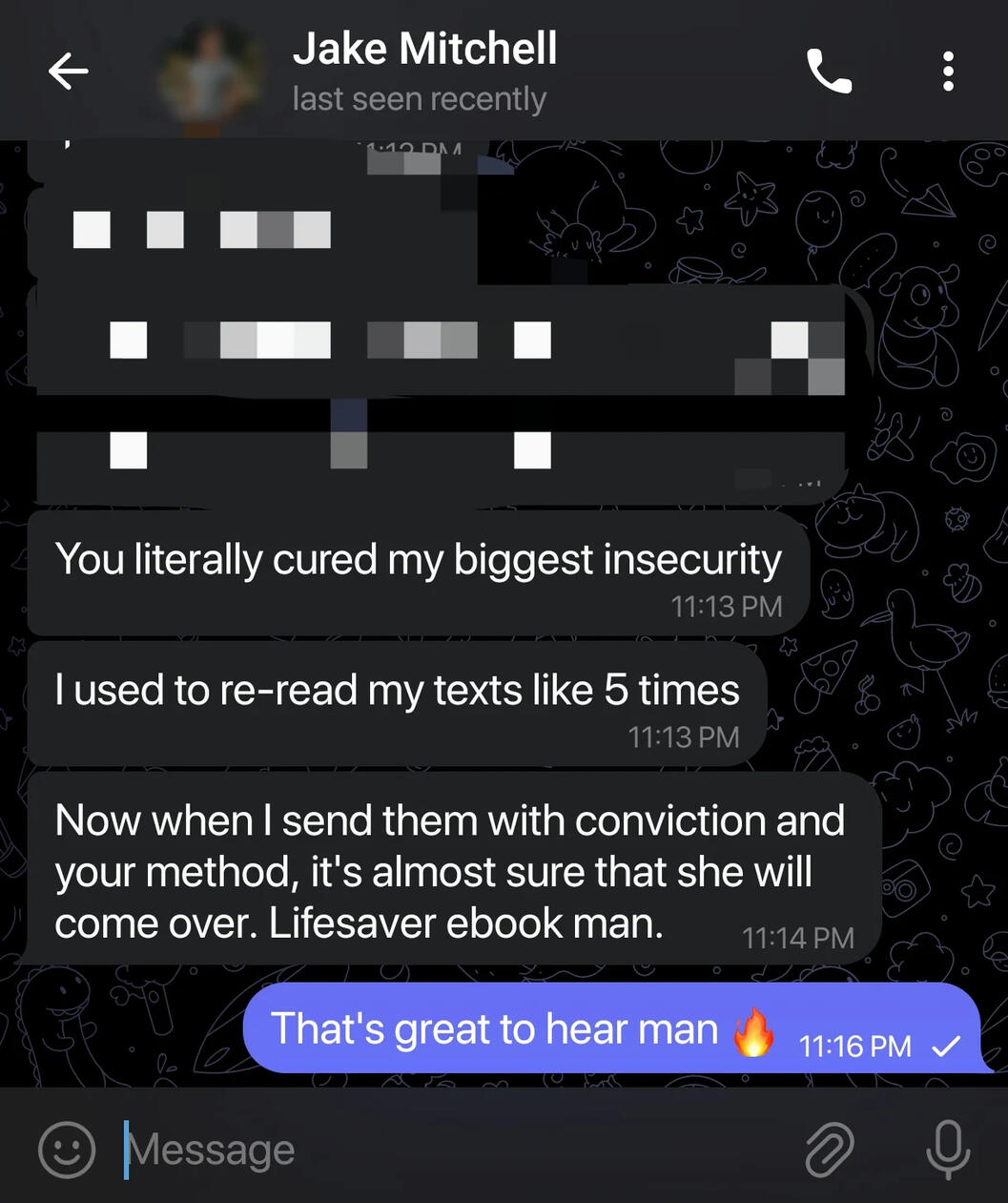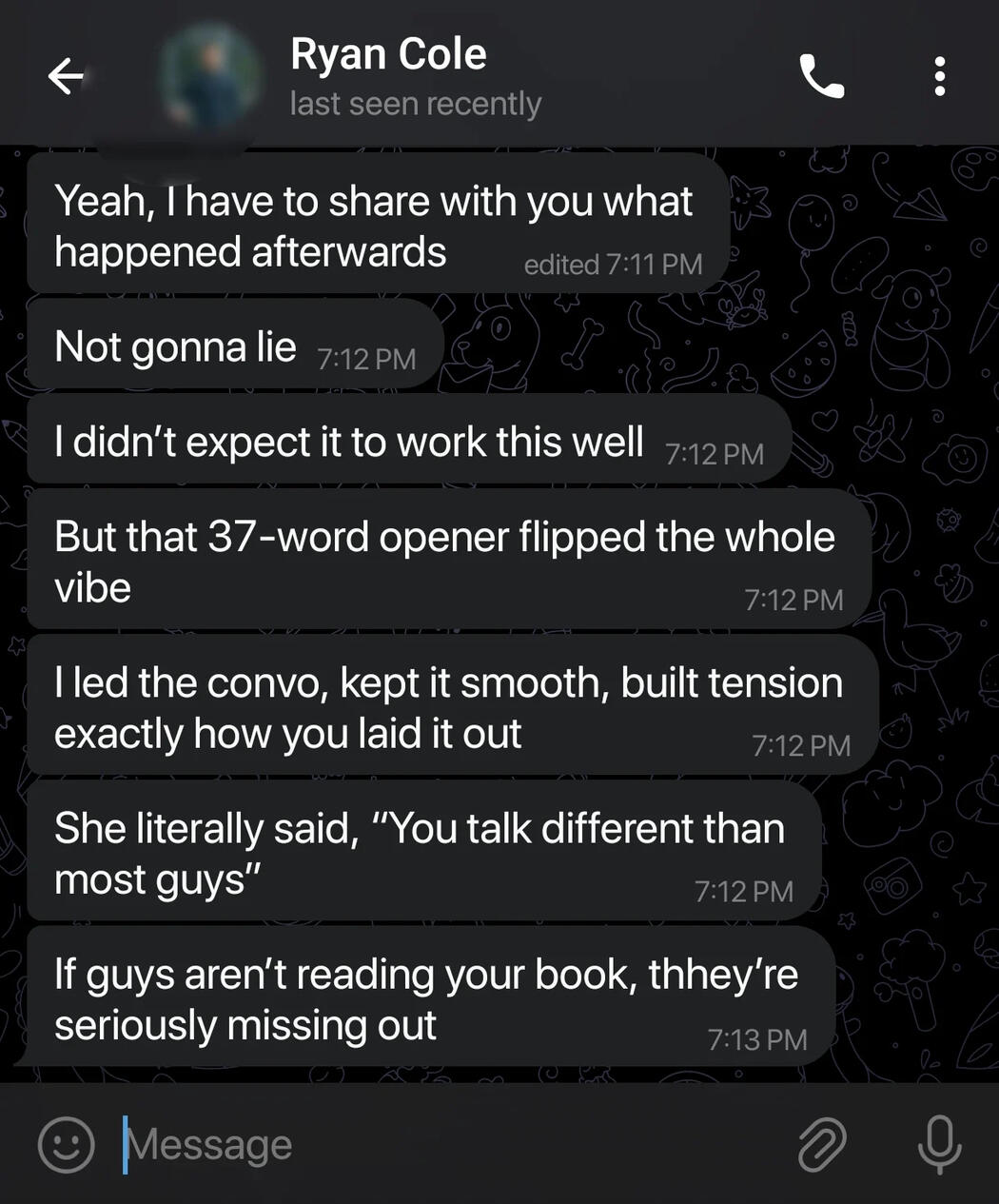 Because like most men, you text like a thirsty intern begging for crumbs:• Your “Hey :)” → gets archived• “How’s your day?” → gets laughed at• “You up?” → gets screenshotted to her friends with 🤢But you become part of the top 5% when YOU master my 37 word text funnel. And then:• She cancels plans for you.